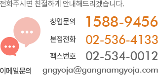 ■ 수집하는 개인정보 항목 회사는 상담, 서비스 신청 등을 위해 아래와 같은 개인정보를 수집하고 있습니다. ο 수집항목 : 이름, 이메일, 연락처 ο 개인정보 수집방법 : 홈페이지(창업문의, 고객의소리, 가맹개설상담) ■ 개인정보의 수집 및 이용목적 회사는 수집한 개인정보를 다음의 목적을 위해 활용합니다. ο 회원 관리 회원제 서비스 이용에 따른 본인확인 , 개인 식별 , 고지사항 전달 ο 마케팅 및 광고에 활용 이벤트 등 광고성 정보 전달 ■ 개인정보의 보유 및 이용기간 회사는 개인정보 수집 및 이용목적이 달성된 후에는 예외 없이 해당 정보를 지체 없이 파기합니다. ■ 개인정보에 관한 민원서비스 회사는 고객의 개인정보를 보호하고 개인정보와 관련한 불만을 처리하기 위하여 아래와 같이 관련 부서 및 개인정보관리책임자를 지정하고 있습니다. 개인정보보호책임자 : 신철호 전화번호 : 1588-9456 이메일 : gngyoja@gangnamgyoja.com 귀하께서는 회사의 서비스를 이용하시며 발생하는 모든 개인정보보호 관련 민원을 개인정보관리책임자에게 신고하실 수 있습니다. 회사는 이용자들의 신고사항에 대해 신속하게 충분한 답변을 드릴 것입니다. 기타 개인정보침해에 대한 신고나 상담이 필요하신 경우에는 아래 기관에 문의하시기 바랍니다. 1.개인정보보호 침해센터 (privacy.kisa.or.kr / 02-405-5118) 2.정보보호마크인증위원회 (www.eprivacy.or.kr / 02-580-9531~2) 3.대검찰청 사이버범죄신고 (spo.go.kr / 02-3480-2000) 4.경찰청 사이버안전국 (www.ctrc.go.kr / 1566-0112)